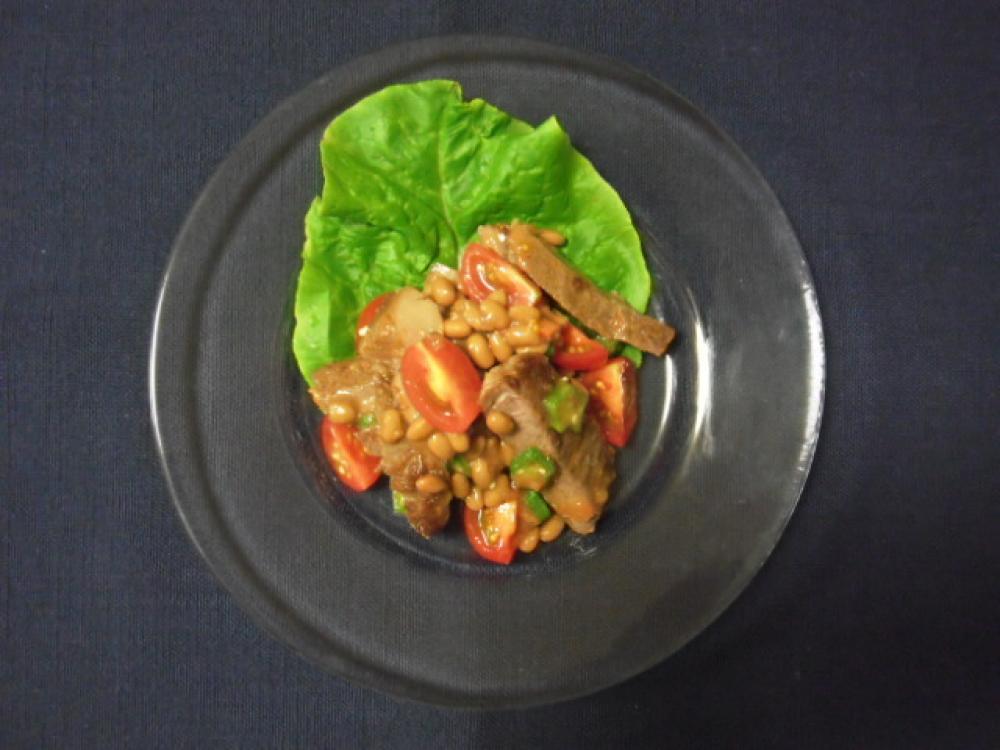 ボウルにポン酢、叩いた梅を入れ混ぜ、そこに④の肉、オクラとミニトマト、納豆を入れ和える。