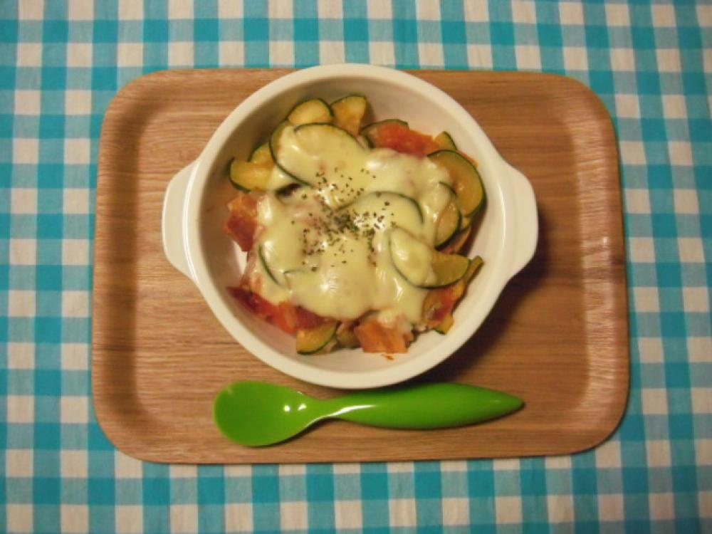 切ったベーコンを入れ炒め、油が出てきたらズッキーニを加え炒め、火が通ってきたら軽く塩こしょうをし、トマトを入れ炒める。