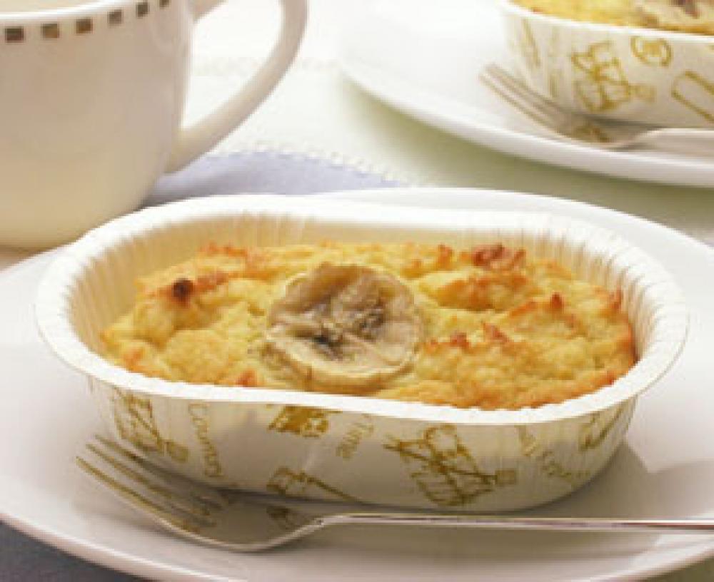 出来上がった生地を型に入れ、上にトッピング用のバナナをのせる。