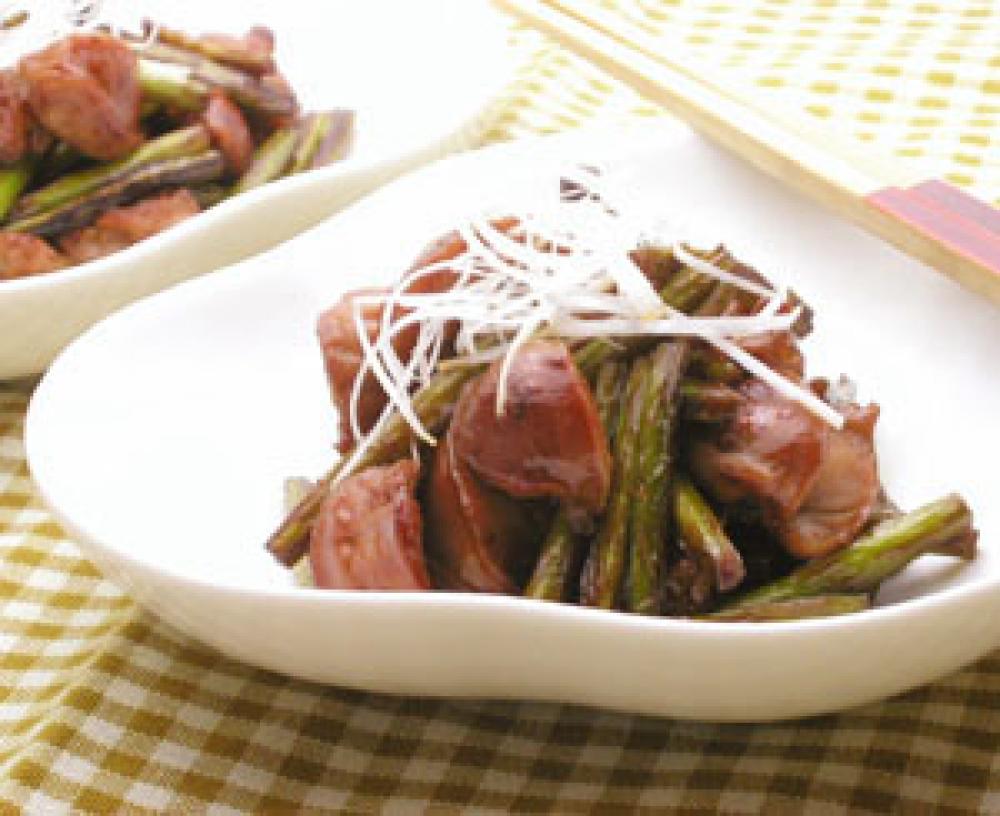 フライパンにゴマ油を熱し、砂肝、にんにくの芽を加えて炒める。