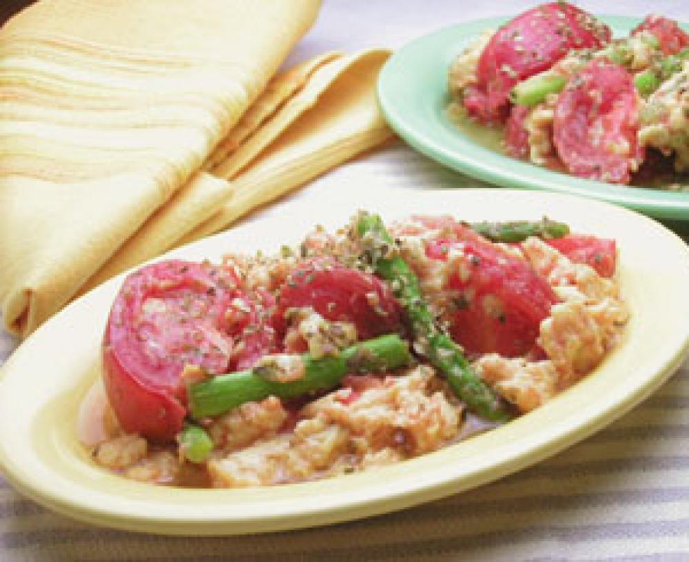テフロン加工のフライパンにサラダ油をひき、アスパラ、トマトを入れて炒める。