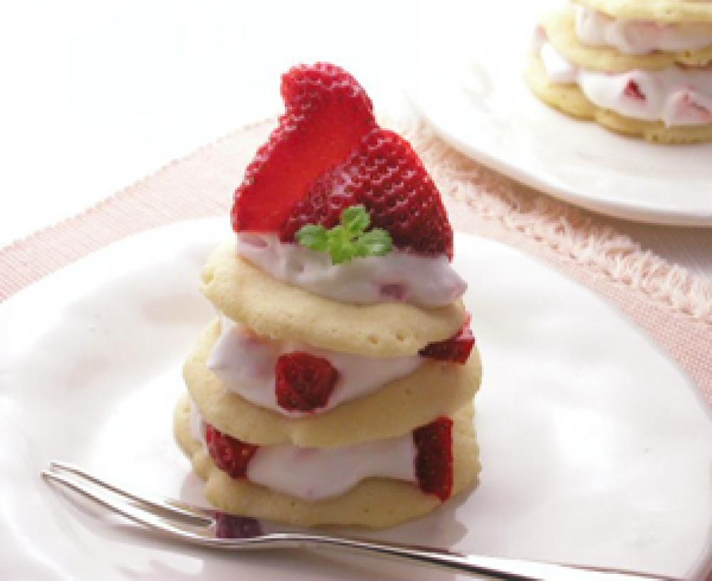 生地に(6)のクリームをのせ、その上に生地を重ねクリームをのせ3層にする。