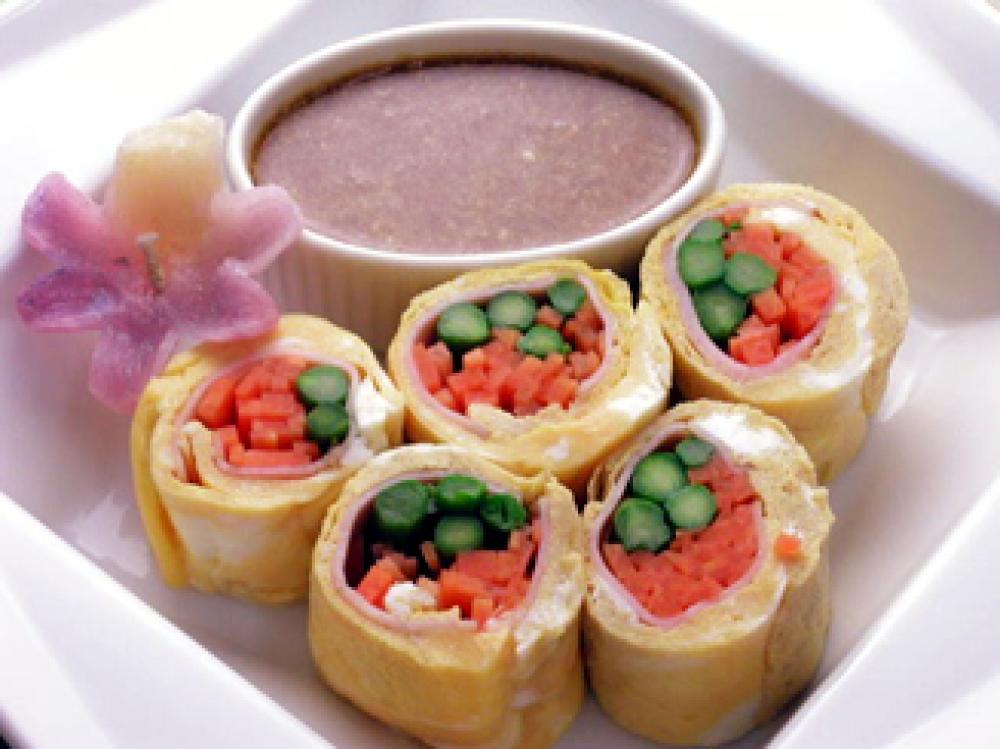卵が温かいうちにラップの上にのせ、その上に、ロースハム、アスパラガス、人参の順に乗せ、
