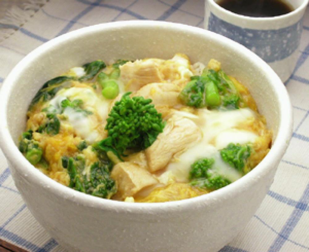 丼鍋に(3)で作っただしを入れ、菜の花、鶏肉を加えて加熱する。
