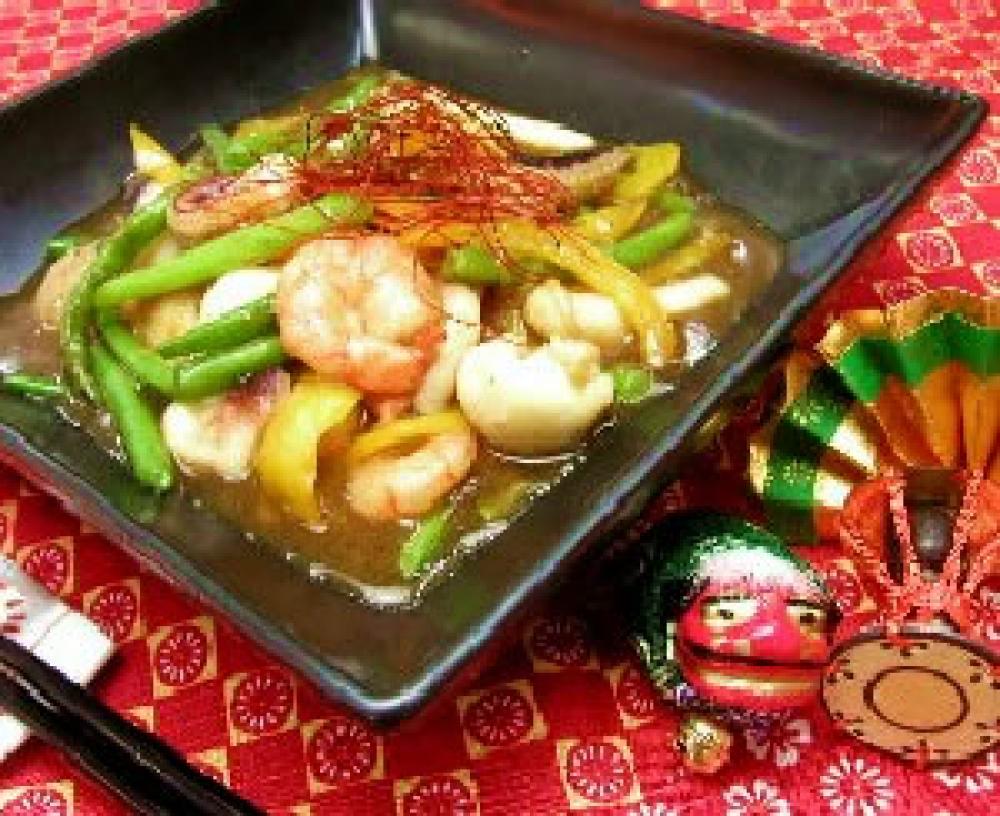 いかは一口大の大きさにきり、海老は背わたをとる。