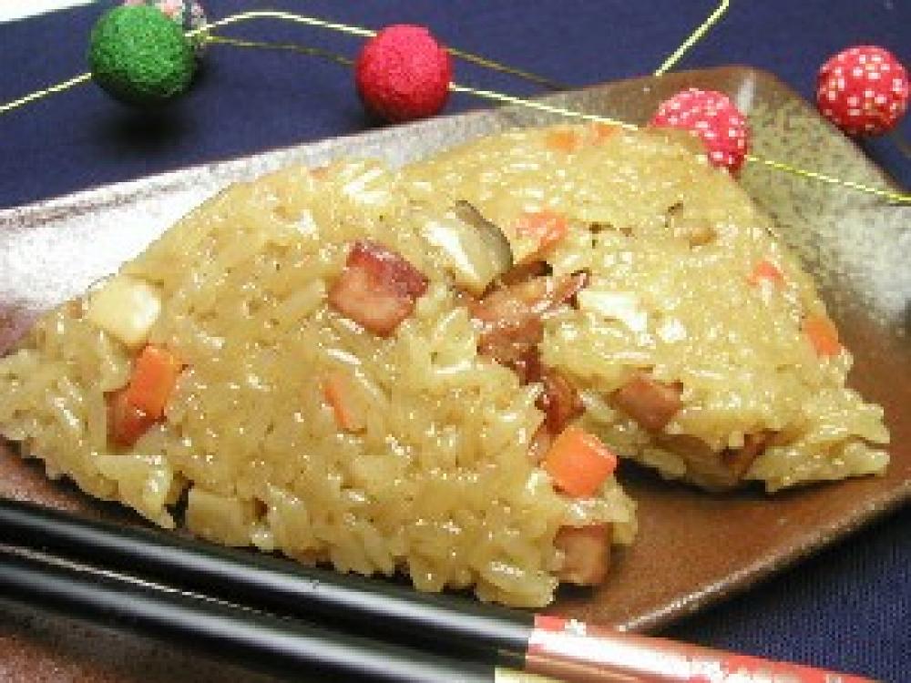別の鍋に油を熱し、米を炒める。(3)に入れ、煮汁がなくなるまで煮る。