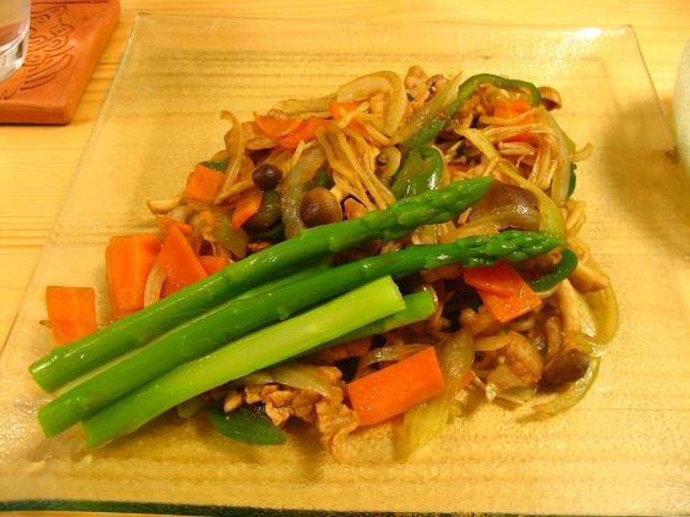 そばを入れて、ソースで味付けして、アスパラはソテーして作っておきます。 |