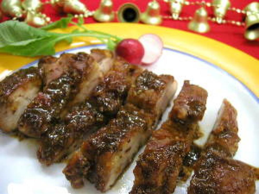 もも肉を器に盛り、マスタードソースをかける。ラディッシュを添えてできあがり。