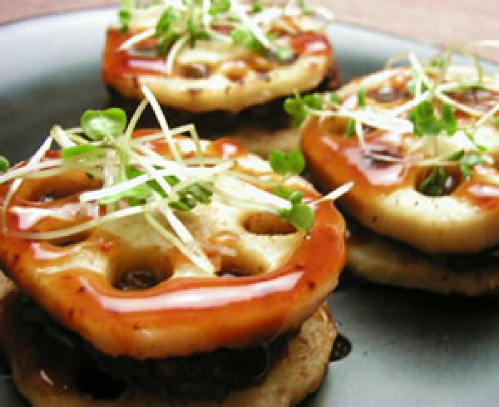 2枚のれんこんの間に(3)をしっかりとはさみこむ。(れんこんの穴にも入るように)