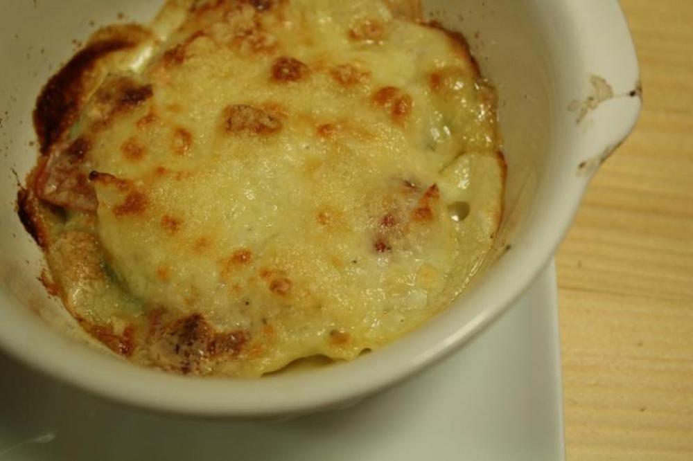 グラタン皿にスライスしたアボガドと薄く切ったトマトを重ねておき、その上に簡単ホワイトソースを乗せてます。