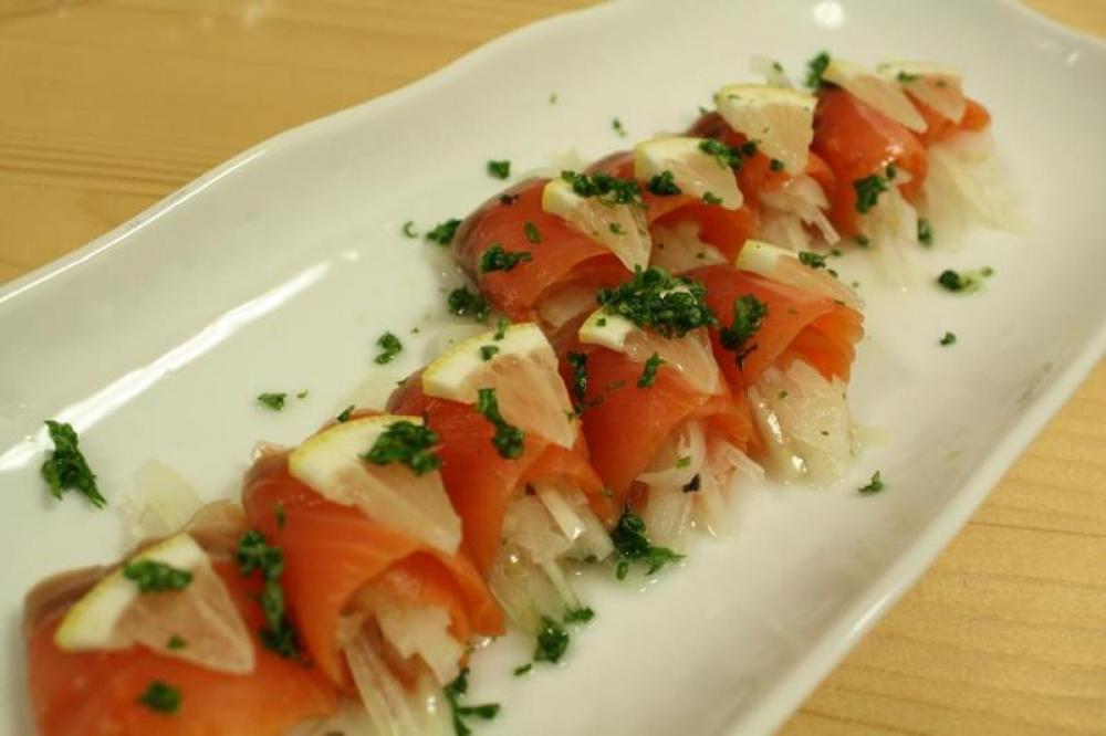 マリネドレシングを混ぜ、スモークサーモンに巻き込んみます。