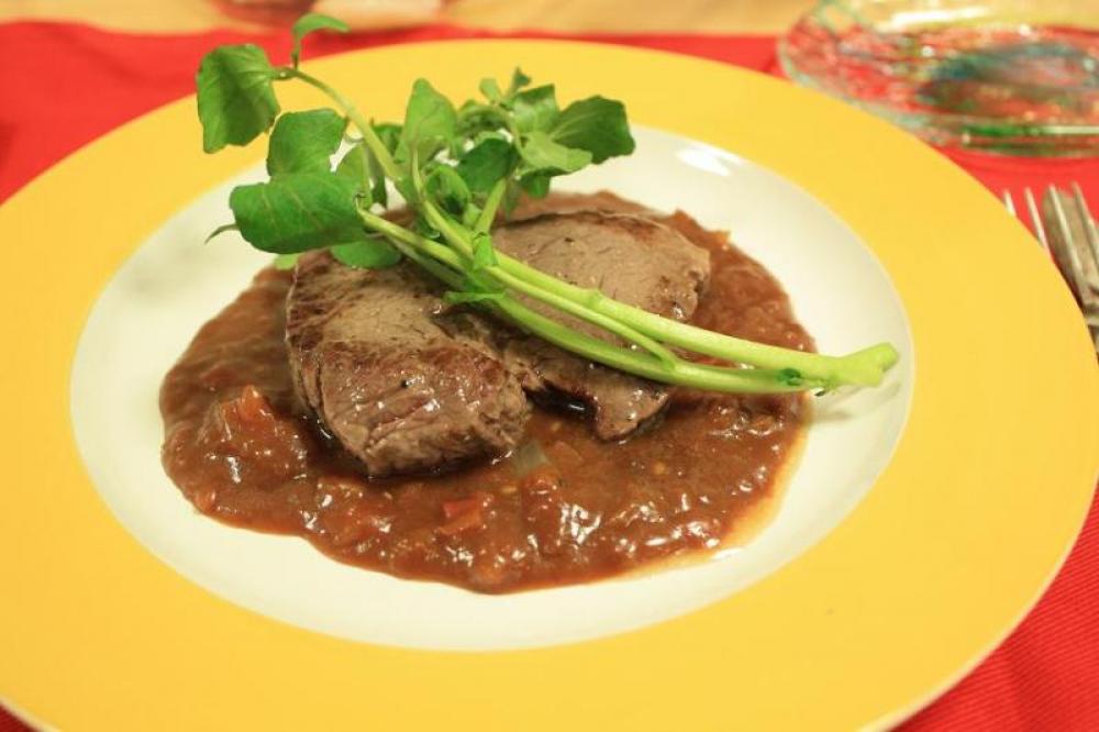 お肉を焼き、お皿にソースをひいて上にお肉を盛り付けます。