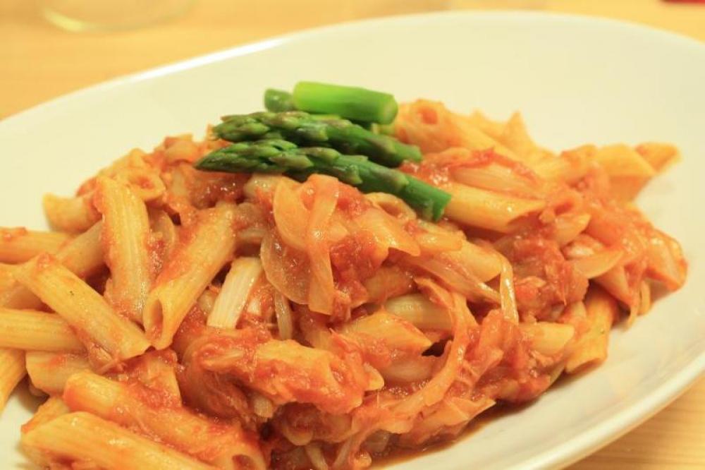 たまねぎを炒め、トマト缶とツナを入れて煮る。