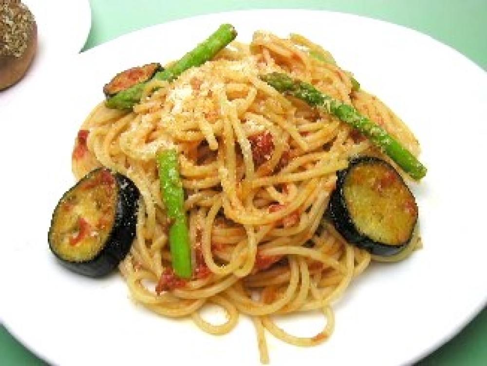 フライパンでなす、アスパラガスを炒めてゆでたパスタを加え、トマトソースとあえる。