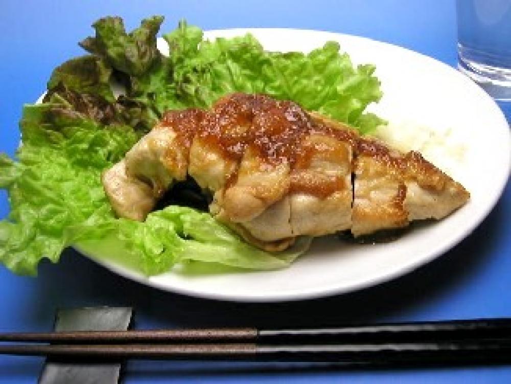 レタスをしき、鶏肉は1cm厚さに切って皿に盛り、(3)のソースをかけます。