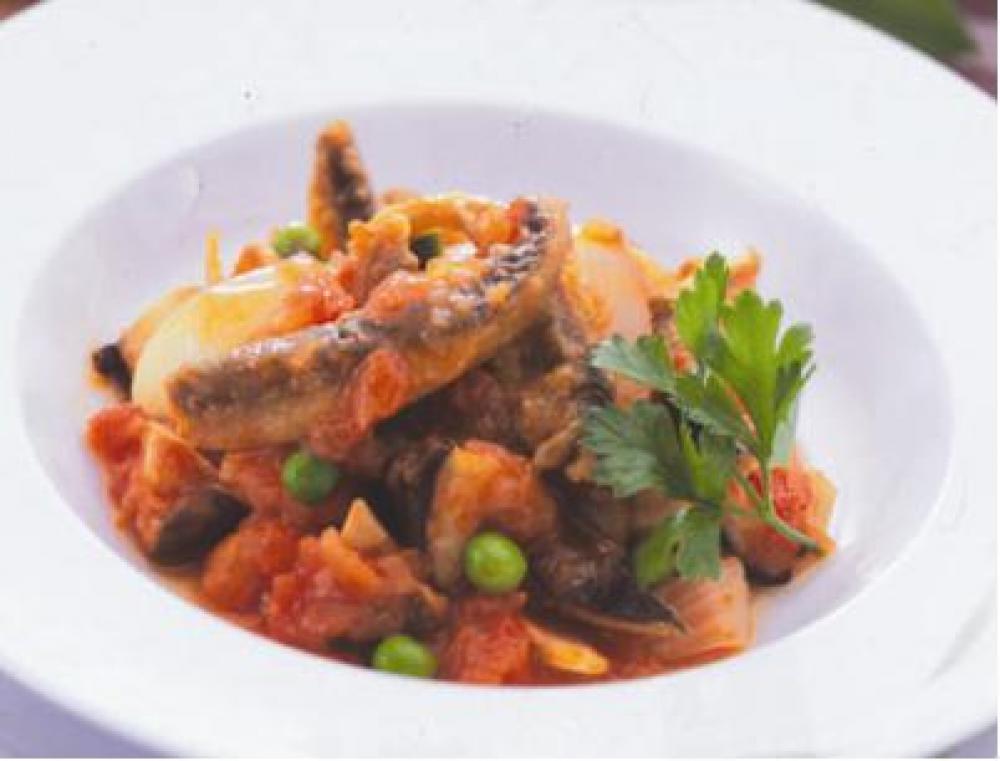 揚げたさんまをトマトソースに加え、煮込む。