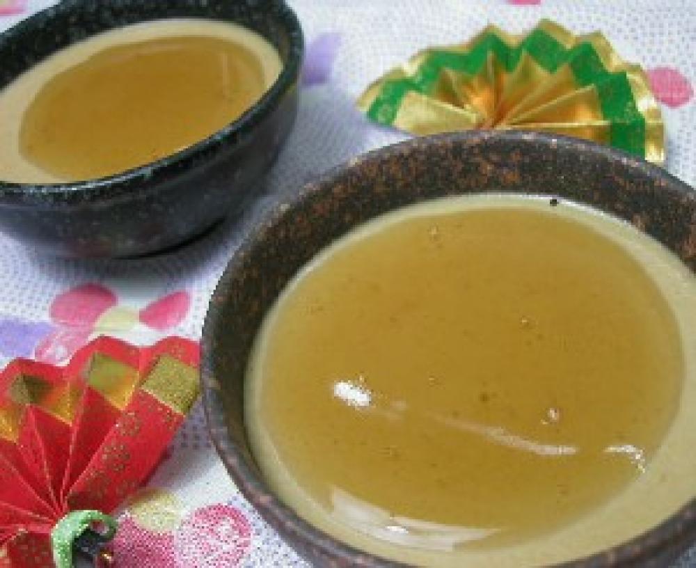 プリンが固まったら、ほうじ茶のソースをかけてできあがり。
