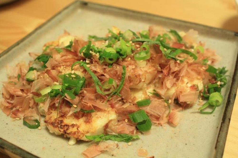 お皿に盛り付けて、ネギや鰹節、白ゴマをまぶしてお好みのつゆやお醤油をかけて完成。
