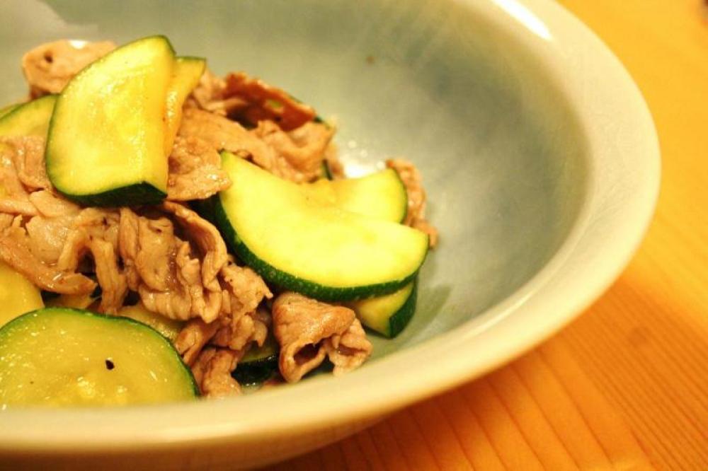 熱したフライパンに油をひいて、ズッキーニお肉を焼いていく。