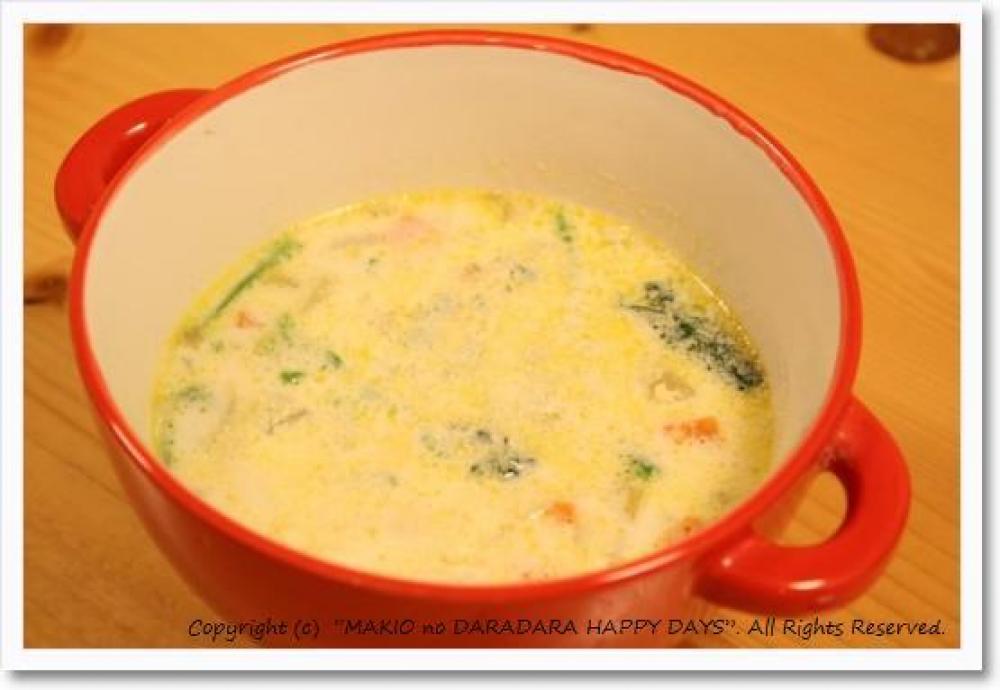 1で残しておいた牡蠣4つを入れて少し煮る。塩コショウで味を調える。