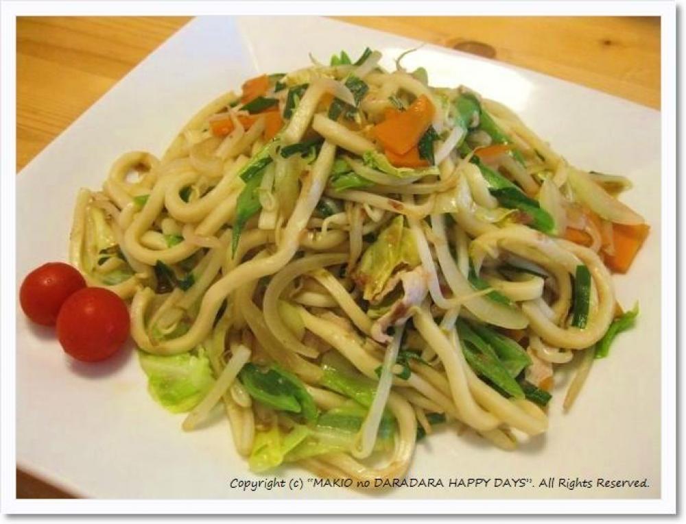 フライパンに油を少々入れ、野菜とお肉を炒める。火が通ってきたら、うどんを入れる。