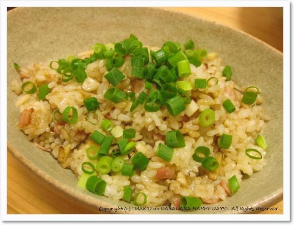 にんにくの香りが出たら、エリンギ、ベーコン、しいたけを炒め、しんなりしてきたら、ご飯を炒めます。弱火で炒めます。