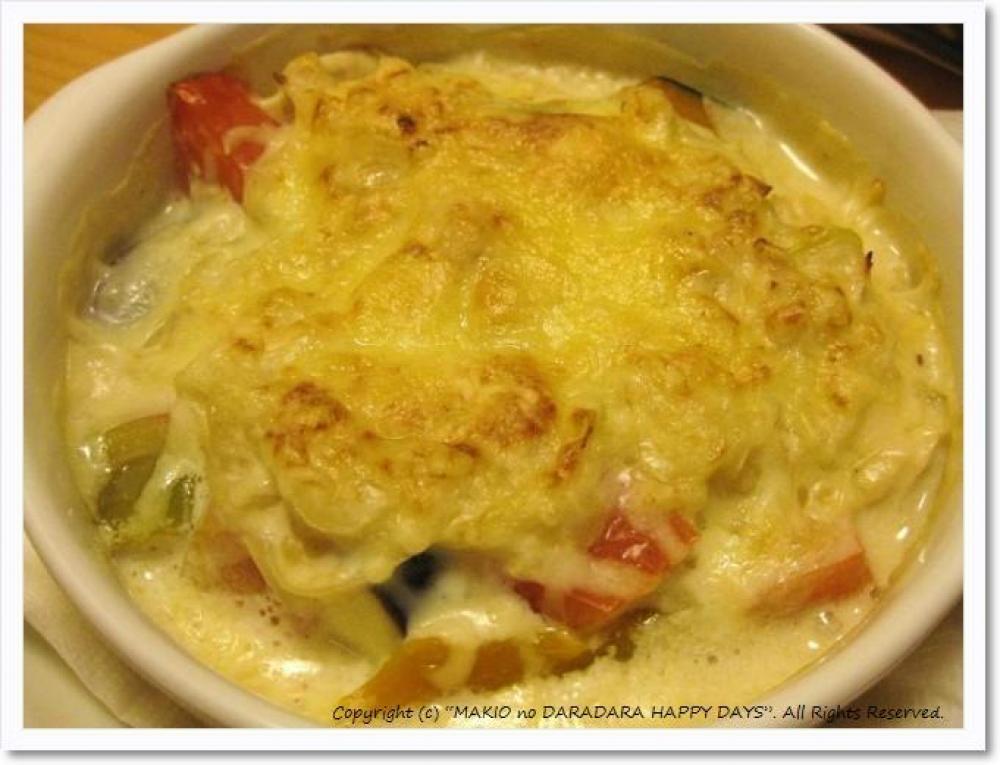 5のホワイトソースをかけて、チーズをかけてオーブンで焼いて完成。