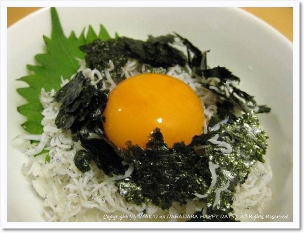 ご飯の上にシソ、のり、シラスをのせて、卵の黄身をポンとのせたら完成(^o^)丿