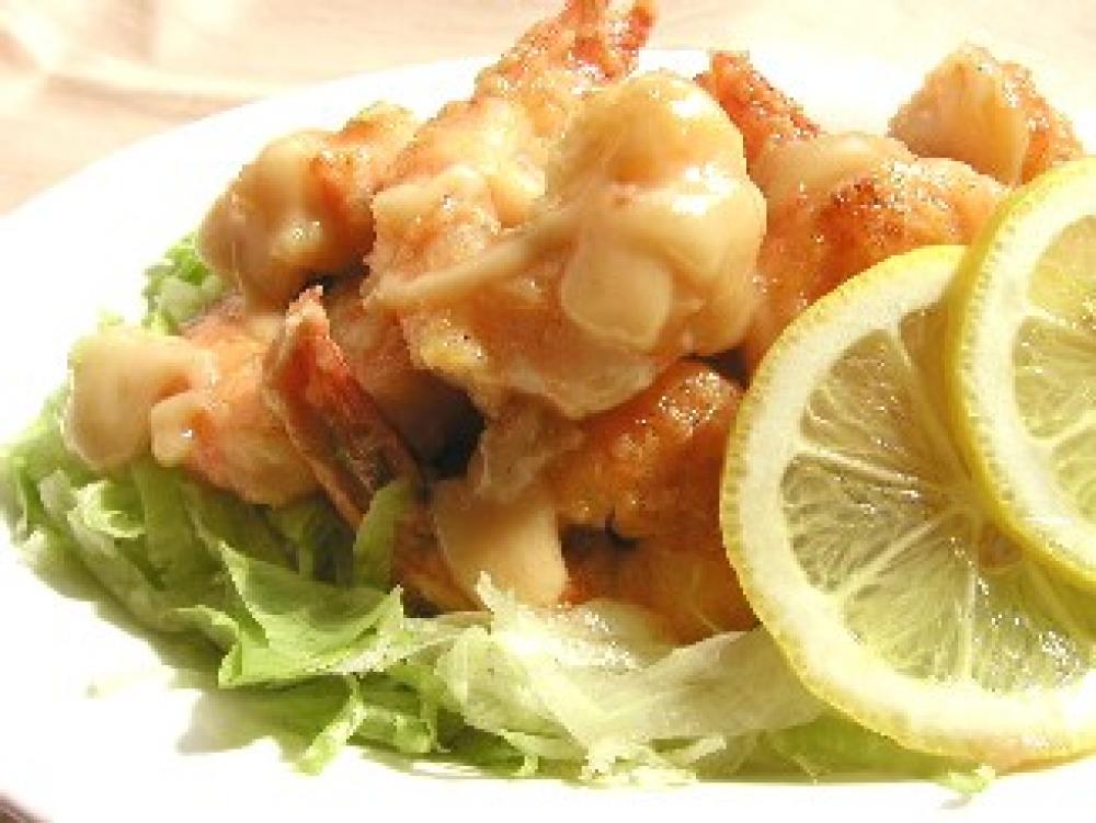 えびは、背わたを取り、ボウルに入れて、片栗粉をまぶし、よくもみ臭みをとる。