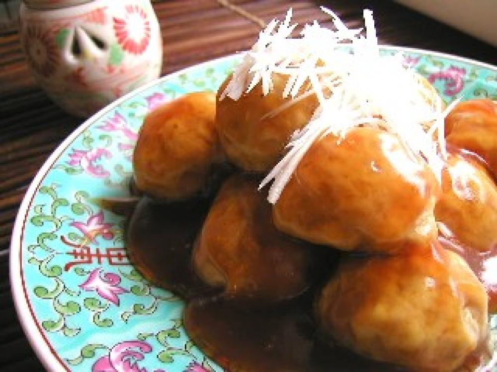 (3)の団子をお皿に入れて、(4)のあんを上にかけたらできあがり。