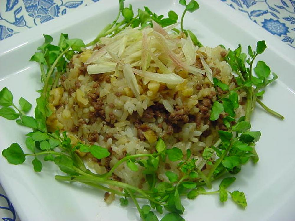 温かいご飯に(4)の肉と煮汁少量を混ぜ合わせ、器に盛ったら、クレソン、くるみ、みょうがを散らして出来上がり。