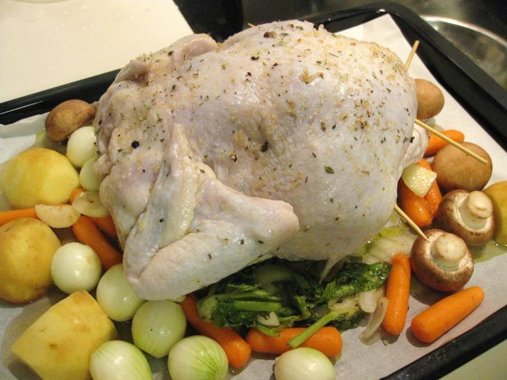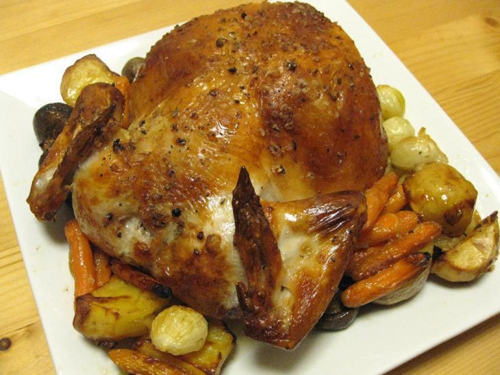 ![]() ?ジャガイモ、人参、ペコロス、マッシュルーム等の野菜を周りに敷き詰め、真ん中に鶏を置く。
