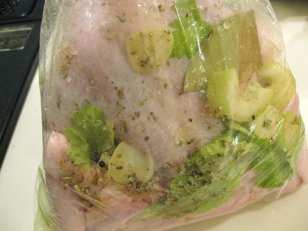ハーブソルトとニンニクをすり込み、セロリ、玉ねぎ、ローリエを入れる。 |