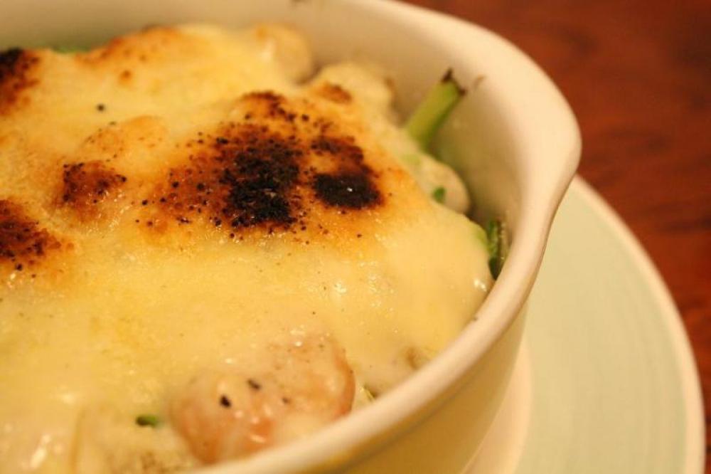 グラタン皿にチキンライスを盛り付け、上に千切りキャベツ(蒸したもの)をのせて、その上にエビ・イカ・ホタテを入れた自家製ホ