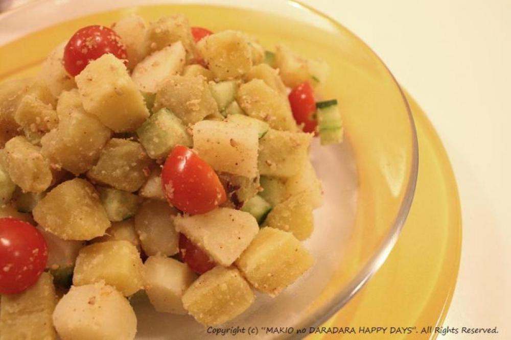 ジャガイモとサツマイモ、きゅうり、トマトをすりごまで和えてます。
