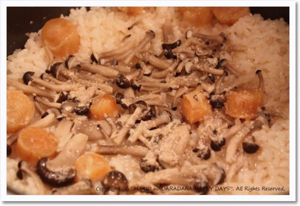 炊飯器にホタテ、しめじ、すりごま、しょうゆ、ダシ汁を入れて炊き込むだけ♪