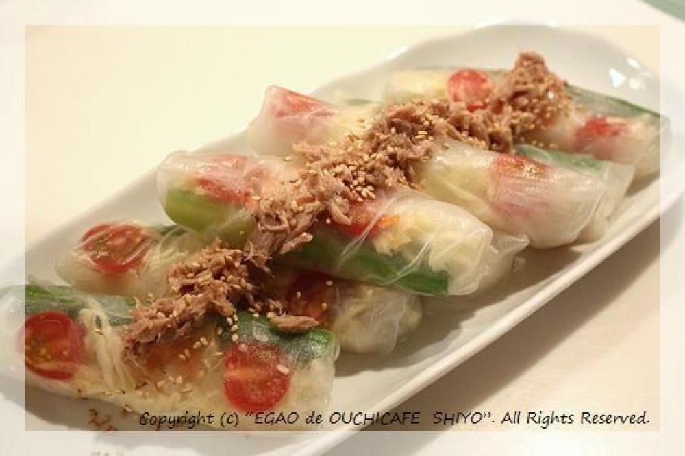 お皿に盛りつけて、ツナと白ゴマを散らして、食べるときにチリソースをたっぷりかけていただきました(^o^)丿