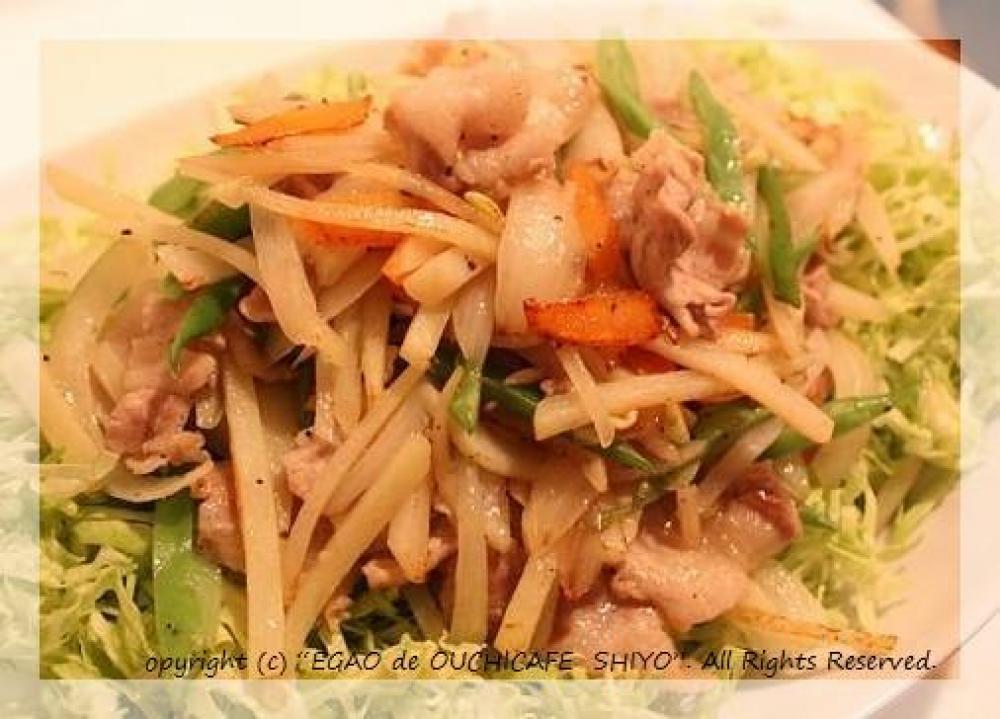 熱したフライパンに油をひいて、お肉と野菜を炒めます。塩、こしょうをして味を整える。