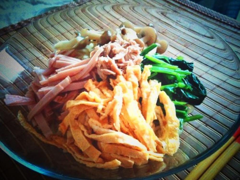 卵は一つまみの塩を入れて薄焼きにして千切りにする。ハムも同様に千切りにする。