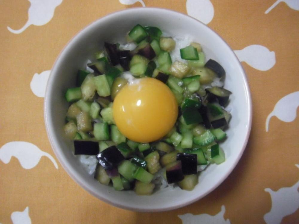 きゅうり、ナスは1㎝角程に切り、それぞれ分量外の塩をまぶし、10分ほど置いた後、水洗いし、よく水気をふき取る。