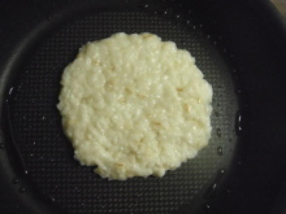 ![]() 白飯と、ほぐした卵白を混ぜ、塩コショウで味付けしゴマ油をしいたフライパンに丸く形作りながらのせ、両面をこんがり焼く。