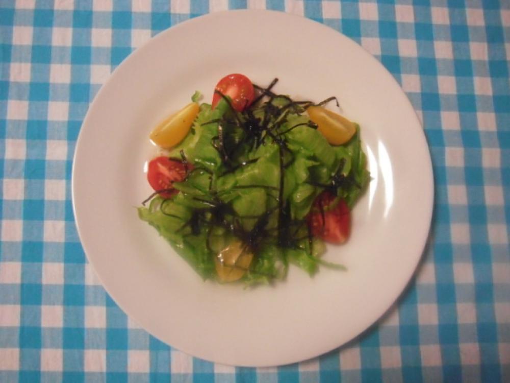 ①のレタス、ピーマンを混合し、盛り付け、ミニトマトを飾り、全体に刻みのりをトッピングする。ドレッシングをかける。