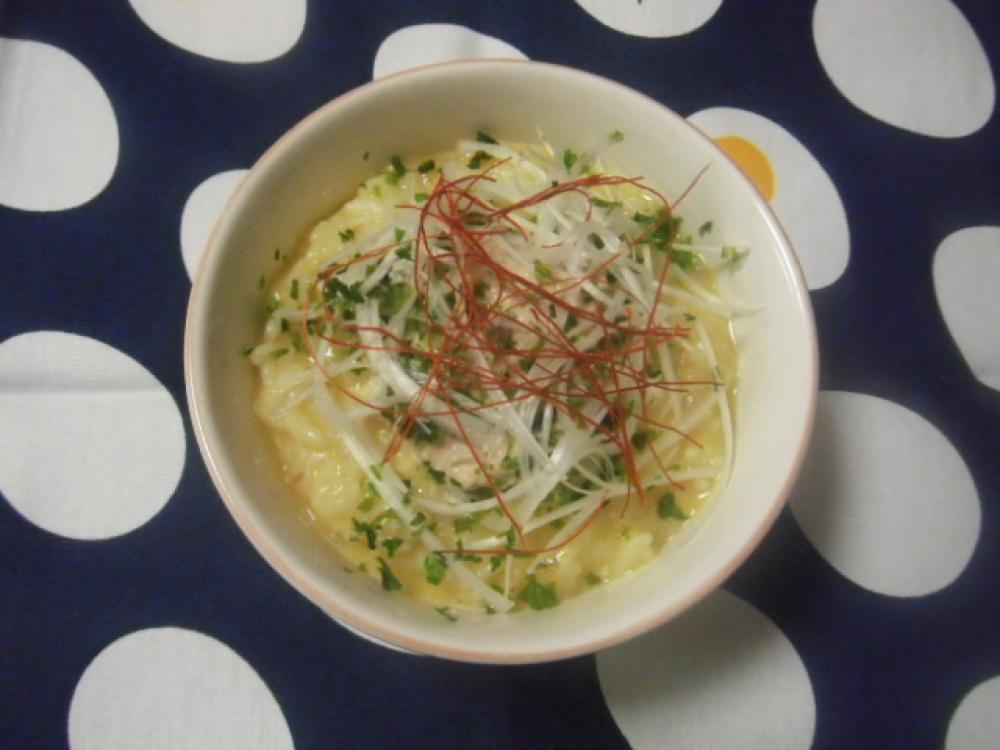 茶碗に①のおじやを盛って、②のツナマヨ、白髪ネギ、青のり、糸唐辛子をトッピング。