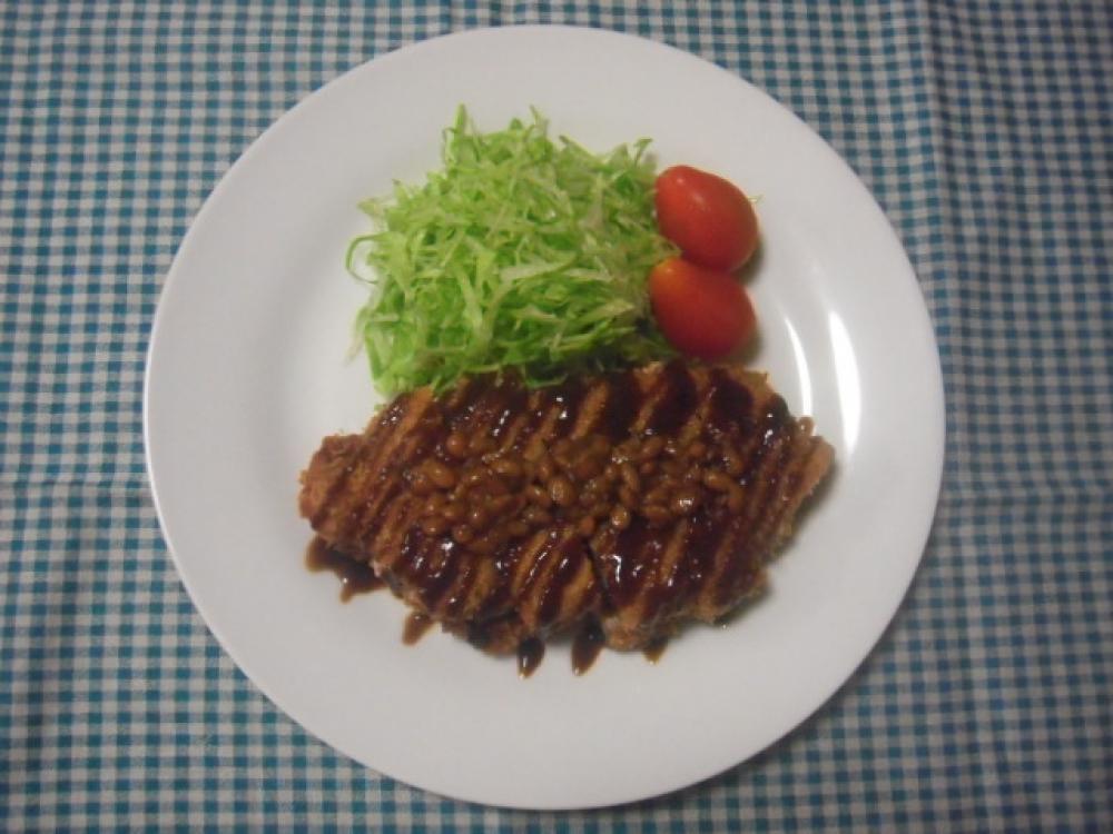 皿に切って盛り付け、とんかつソースとからしを混ぜたものをかけ、納豆が余ってたら、カツの上にのせる。