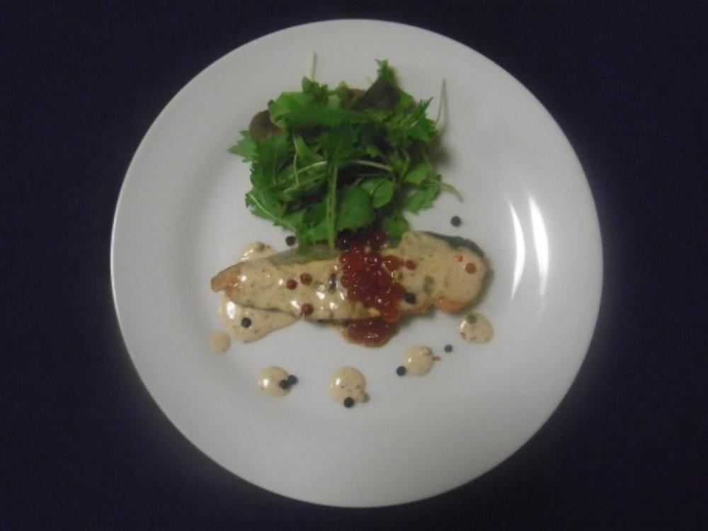 皿に③の鮭を盛り付け、④のソースをかけ、いくらを沿え、ミックスペッパーを全体にかけ、付け合せのサラダを盛る。