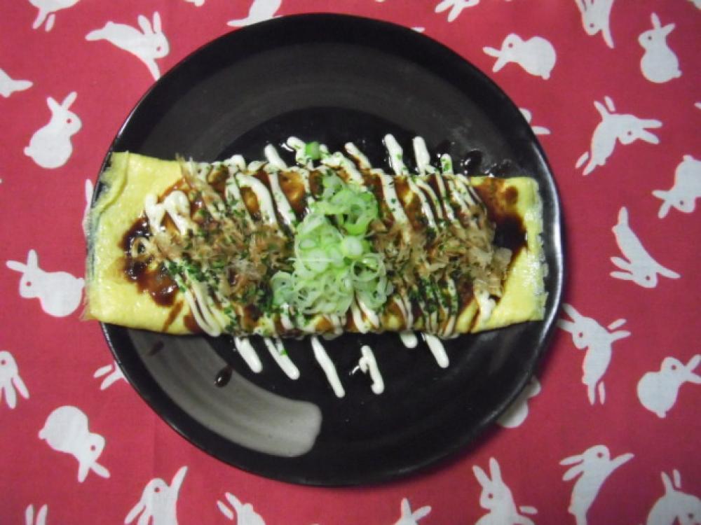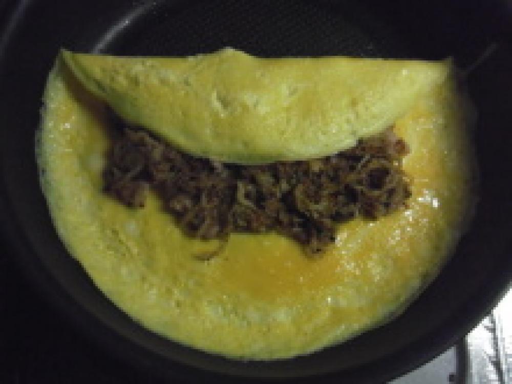 ![]() 半熟状態で、①の具材を真ん中に入れ、卵の両端から包む。