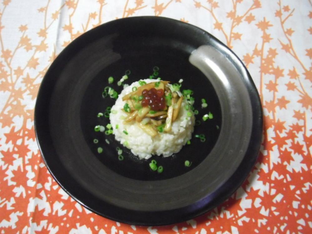 香りが出てきたところで、みじん切りのエリンギAを入れ炒め、白飯、和風だしを入れ、煮詰めながらる。