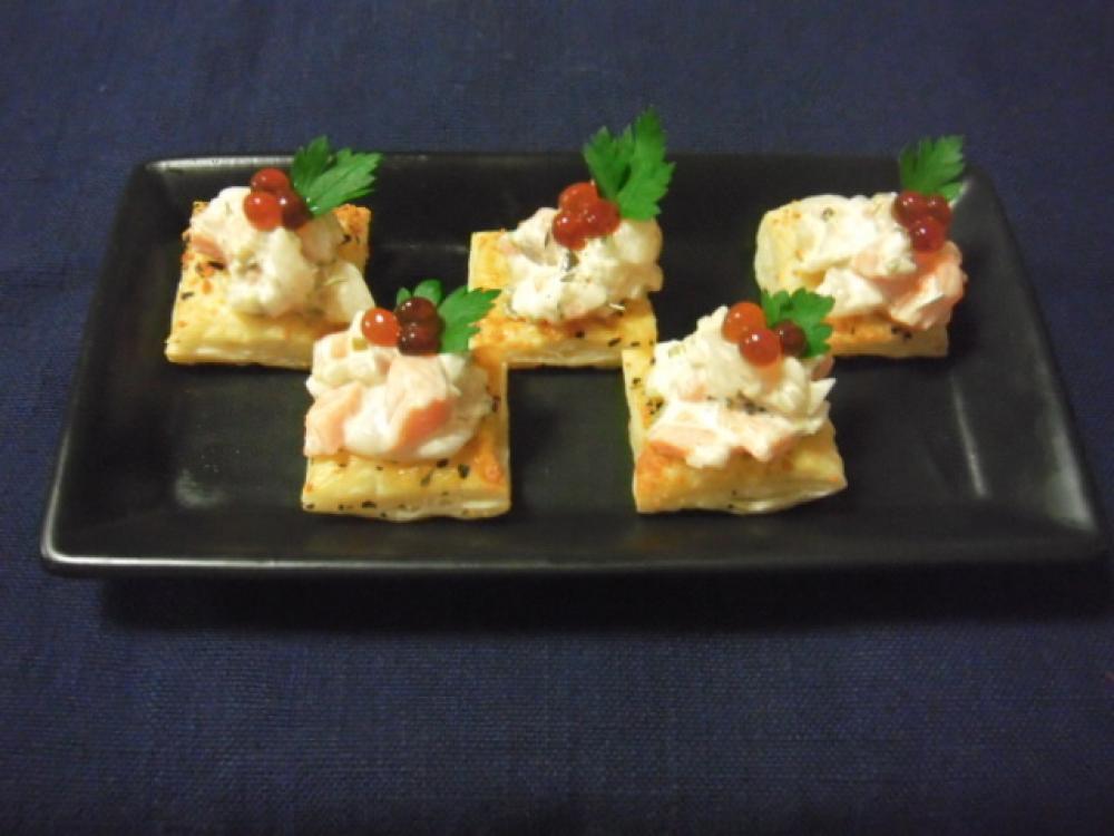 玉ねぎはみじん切りし、塩もみした後水洗いし水気をとる。帆立貝柱、サーモンは1㎝角ほどにカットする。軽く塩こしょうをふる。