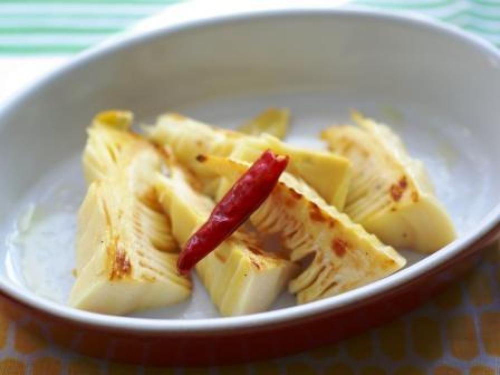 そのままのフライパンに竹の子をいれて香ばしくソテーし、皿にもりつけ、3のにんにく、唐辛子をのせる。