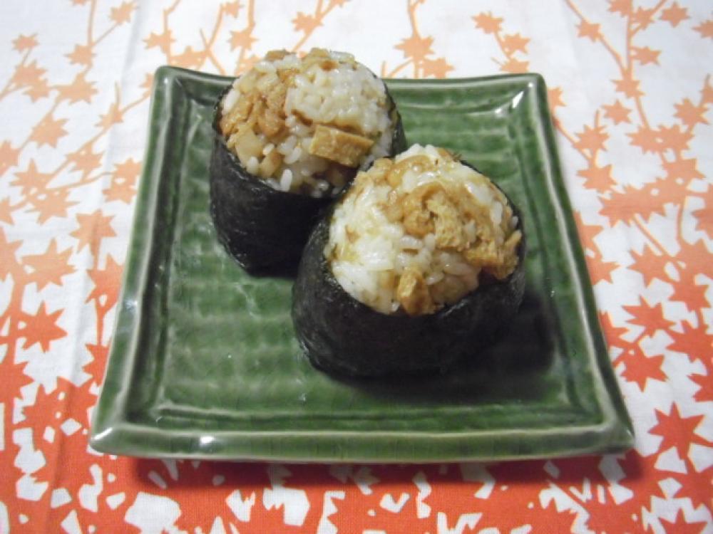 白飯に②を混ぜ込み、おにぎりをにぎって、のりを巻く。